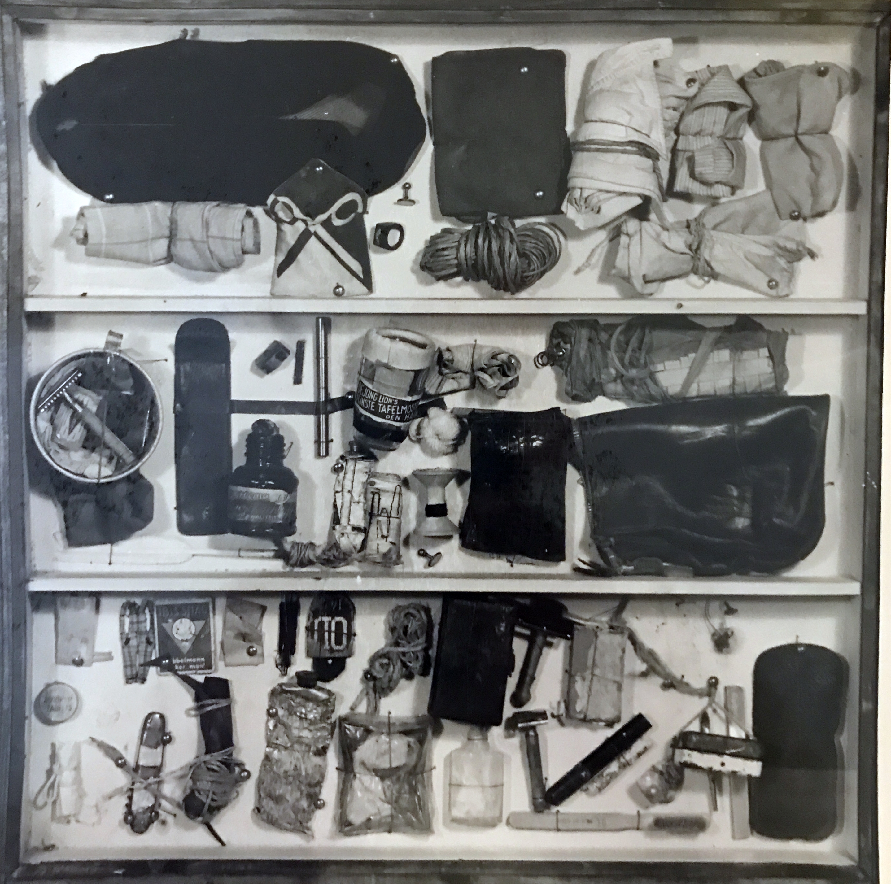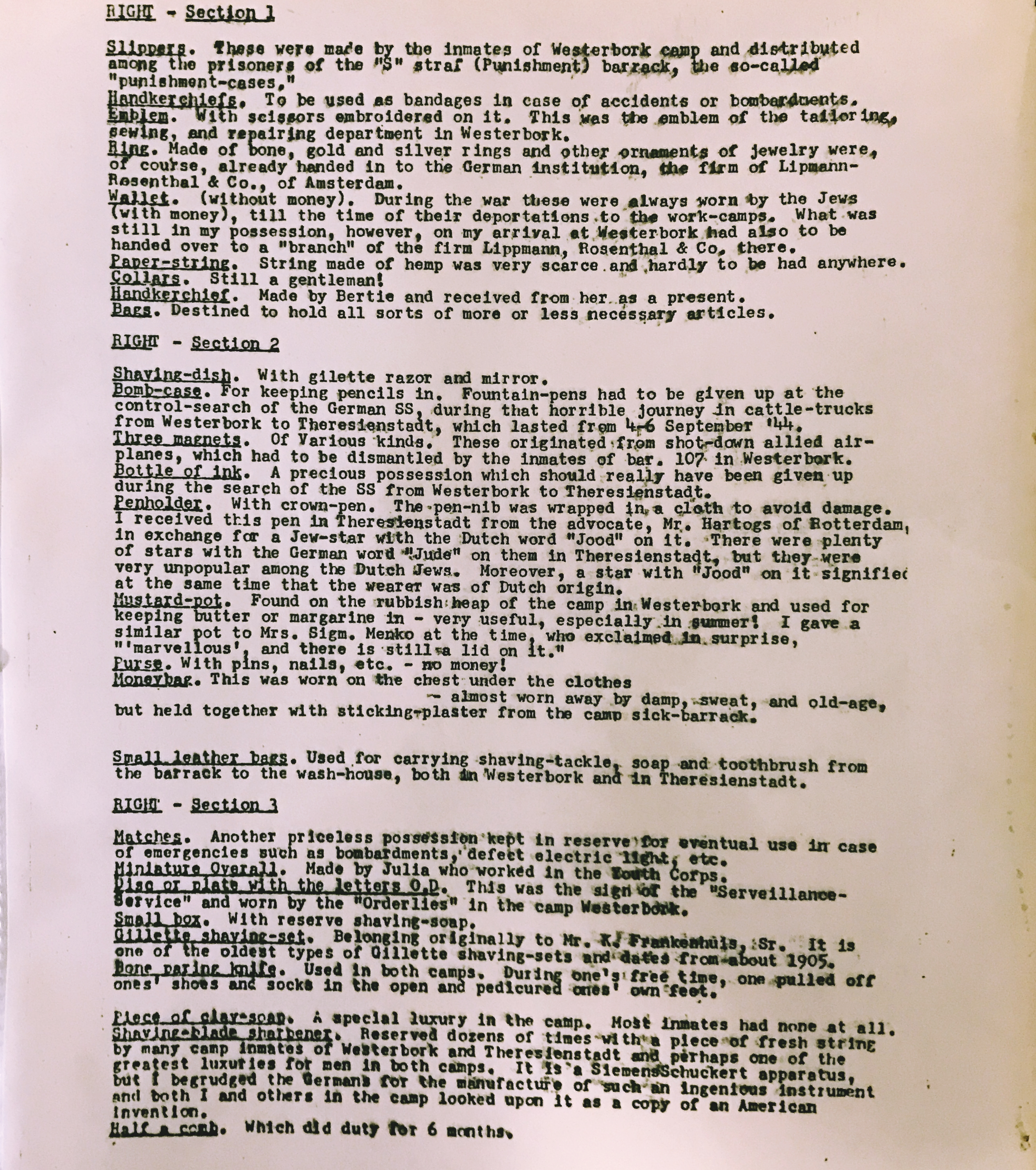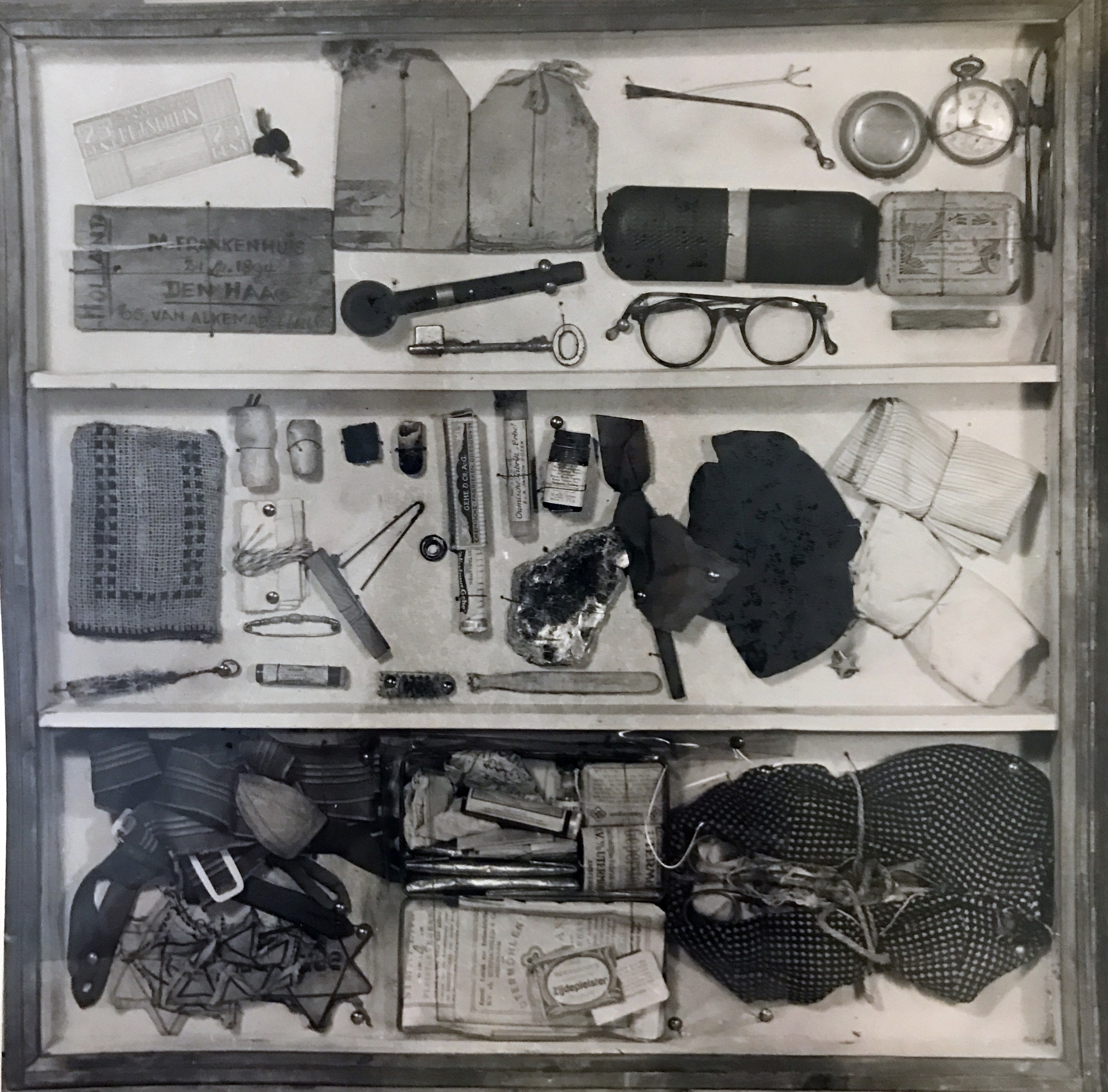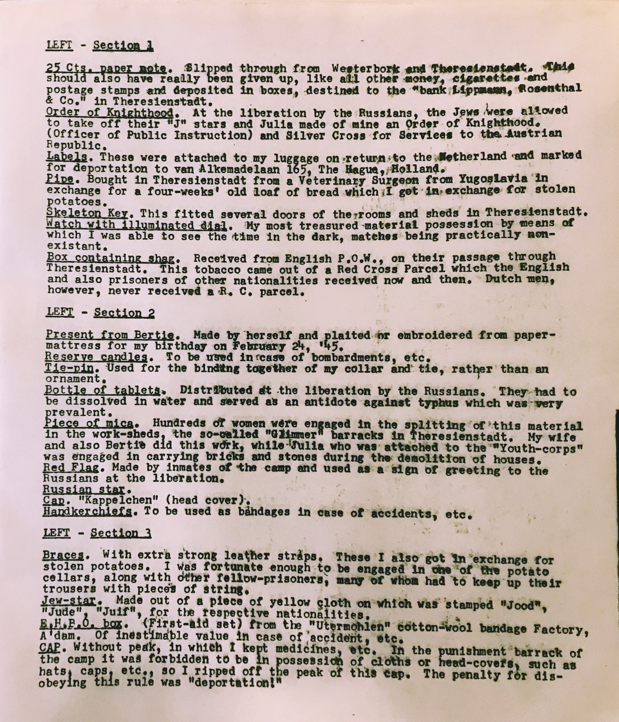 Two custom display cases created by Maurice Frankenhuis to house all of his personal effects that he managed to carry with him through the camps and left with. His descriptions on the left are his full explanation and expressive regard for its value to him in the environment of the concentration camps.
